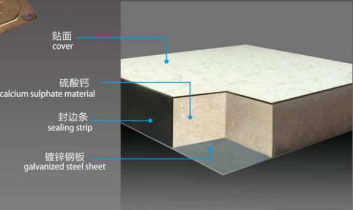 The base material is made of non-toxic and unbleached plant fiber as the reinforcement material, combined with calcium sulfate crystals, and pressed by pulse. The bottom is pasted with high-quality galvanized steel or embossed aluminum foil. The four sides are sealed with static conductive edge strips. The surface is pasted with HPL as required. , PVC, ceramic, rubber and other anti-static finishes. This product has a comfortable foot feel, no hollow feeling, and almost the same as the ground. It has the characteristics of no noise when walking, long service life, good fire resistance, and superior acoustic performance.